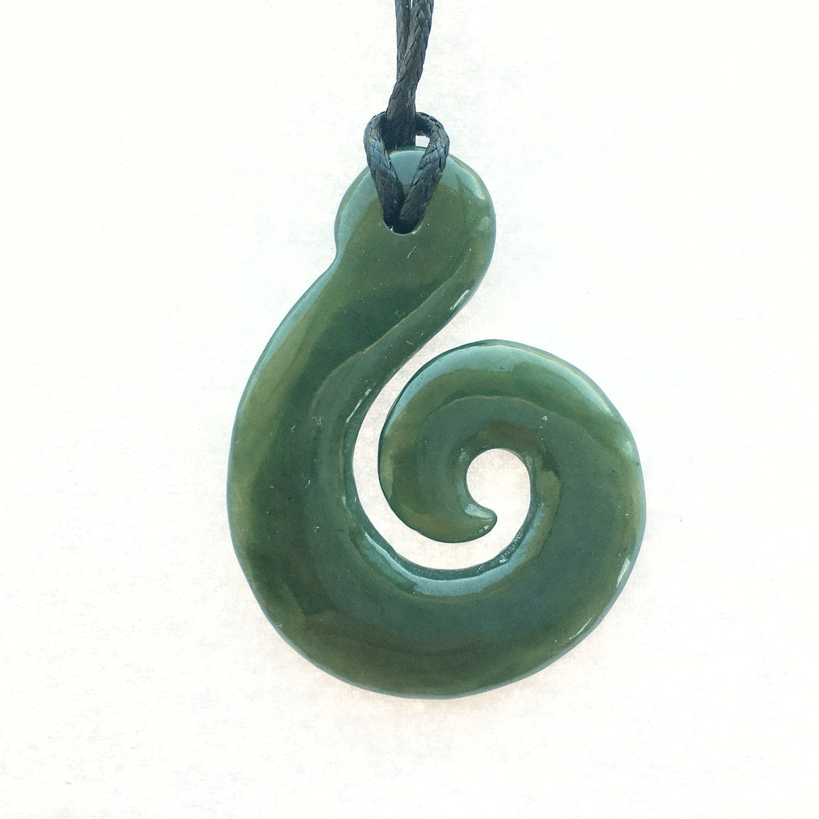 A compact, elegant Hook–Koru pendant hand-carved from dark green nephrite . The Hook (hei matau) symbolizes strength, prosperity and safe journeys; the Koru stands for new beginnings, growth and harmony. Smoothly polished with a comfortable profile for daily wear.