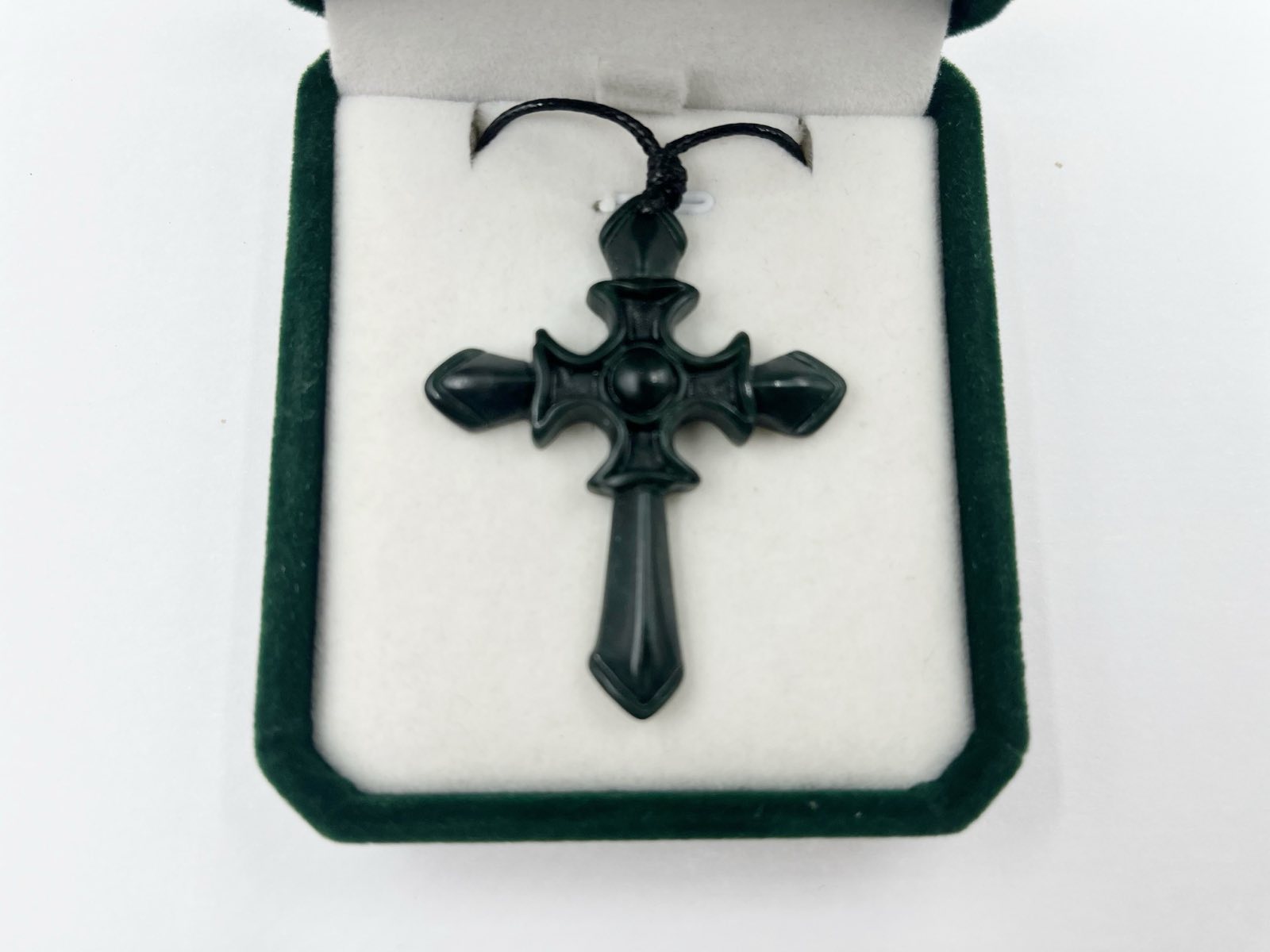 A beautifully crafted Greenstone Cross Pendant made by Carving Studio NZ. Carved from deep dark nephrite jade.